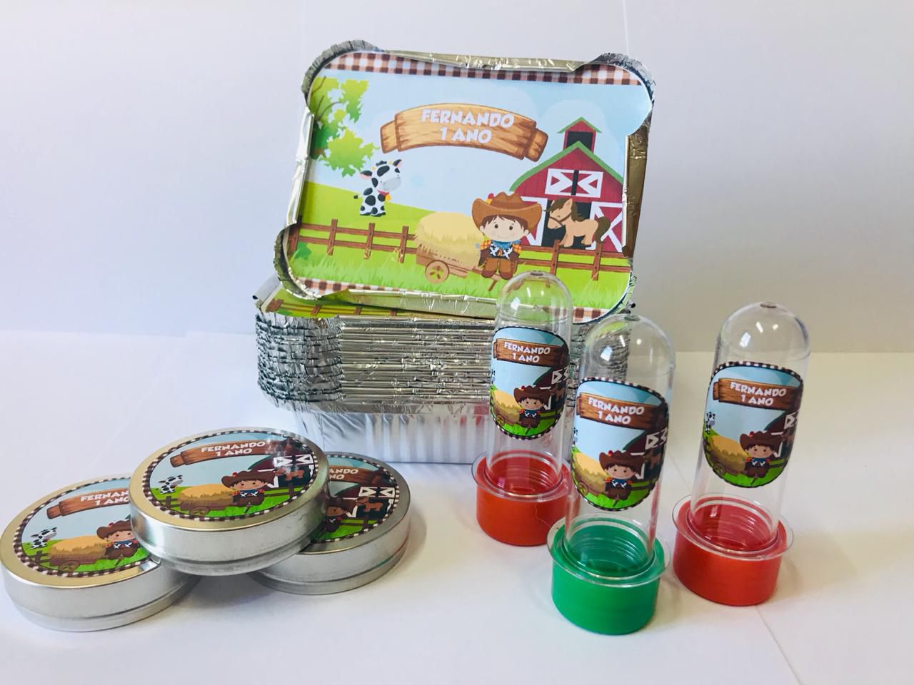 30 Tubetes + 30 Latinhas + 30 Marmitinhas Personalizados - Fazendinha Menino